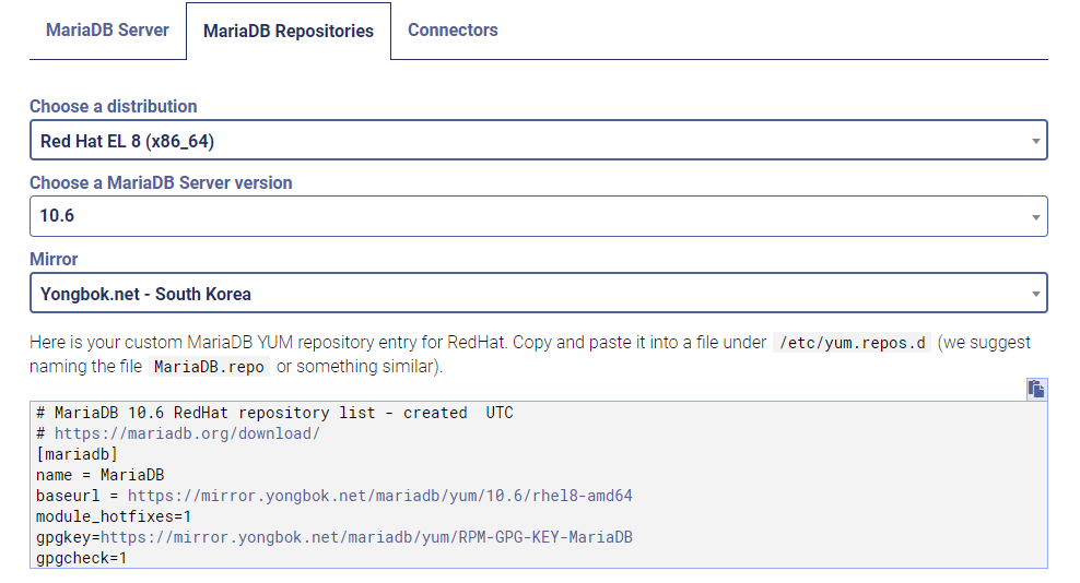 위의 링크에 들어가서 OS 버전과 MariaDB 버전을 선택하면 repo 내용이 생성된다.